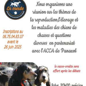 Nous vous attendons nombreux ce vendredi pour une soirée d’échanges et de convivialités autour du chien. Plusieurs thèmes (la sélection, les maladies, …) seront abordés ainsi que vos retours d’expériences qui seront développés autour d’un débat organisé avec des prises de paroles. S’en suivra un casse croûte pour clôturer cette réunion . Pensez à réserver.